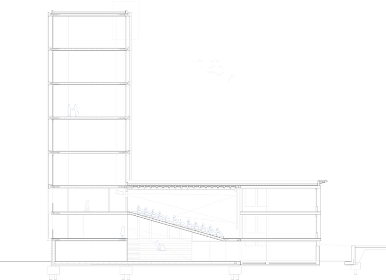 Additionally, the design introduces a tower dedicated to workshops and exhibition areas, embodying principles of transparency. Built with a double glass curtain wall, the tower offers uninterrupted views of the Nervión River, creating a visual connection to Bilbao's landscape. Service cores with elevators and wet rooms are positioned along the sides, freeing the central space for flexible, light-filled areas. Constructed with reinforced concrete arld a double curtain wall facade incorporating solar control systoms, the building enhances energy efficiency and comfort. This state-of-the-art facility will host workshops, screenings, and exhibitions, bridging Bilbao's industrial past with its innovative future in the cinematic arts.